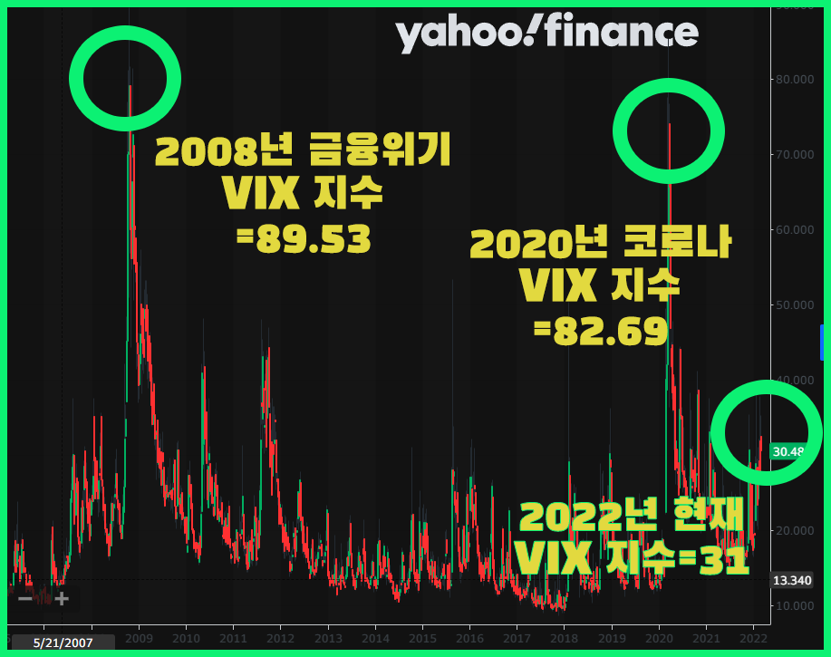 VIX 차트를 보면 2008년 금융위기나 2020년 코로나 발발 때를 보면 지수가 80를 훌쩍 넘어버렸습니다.